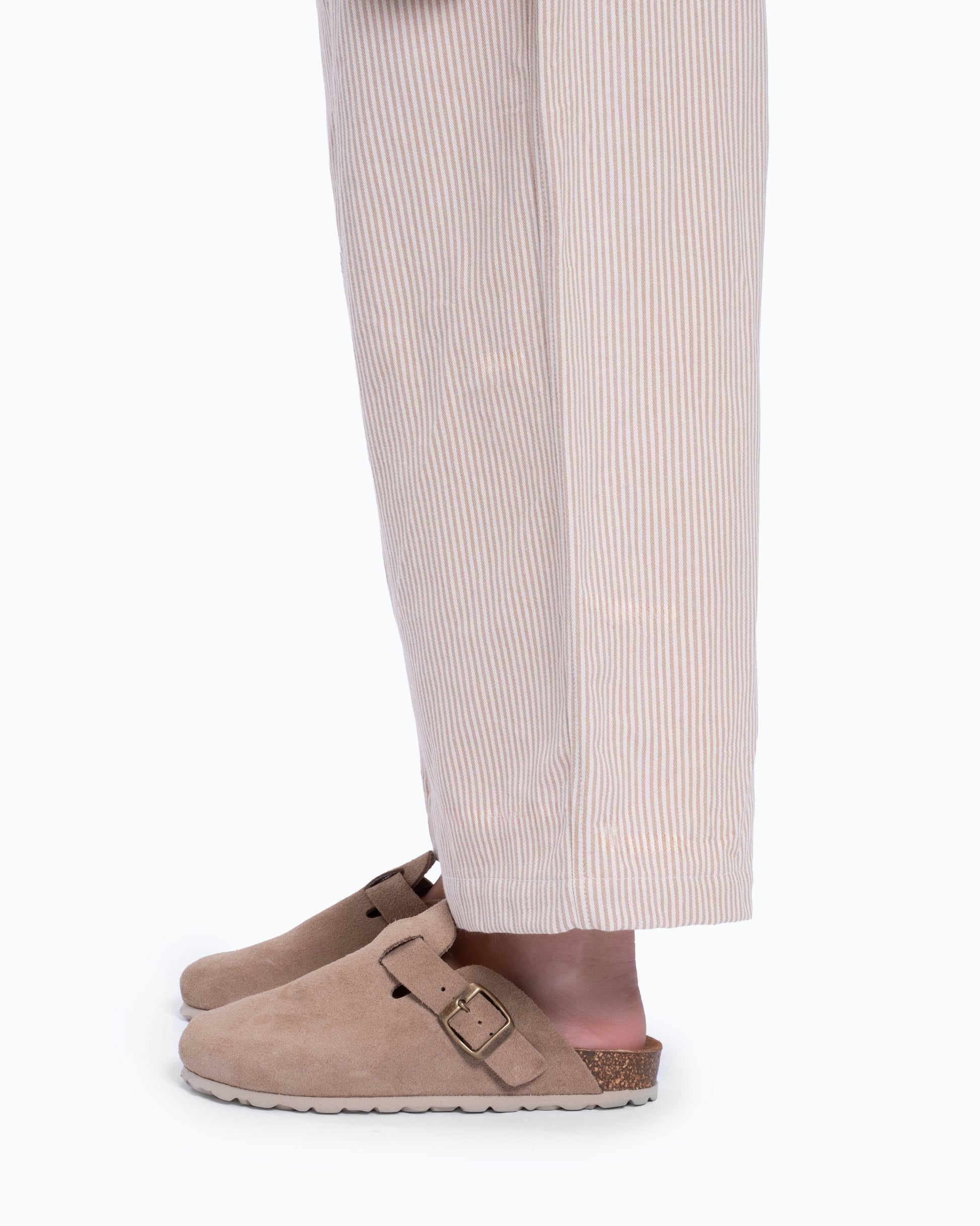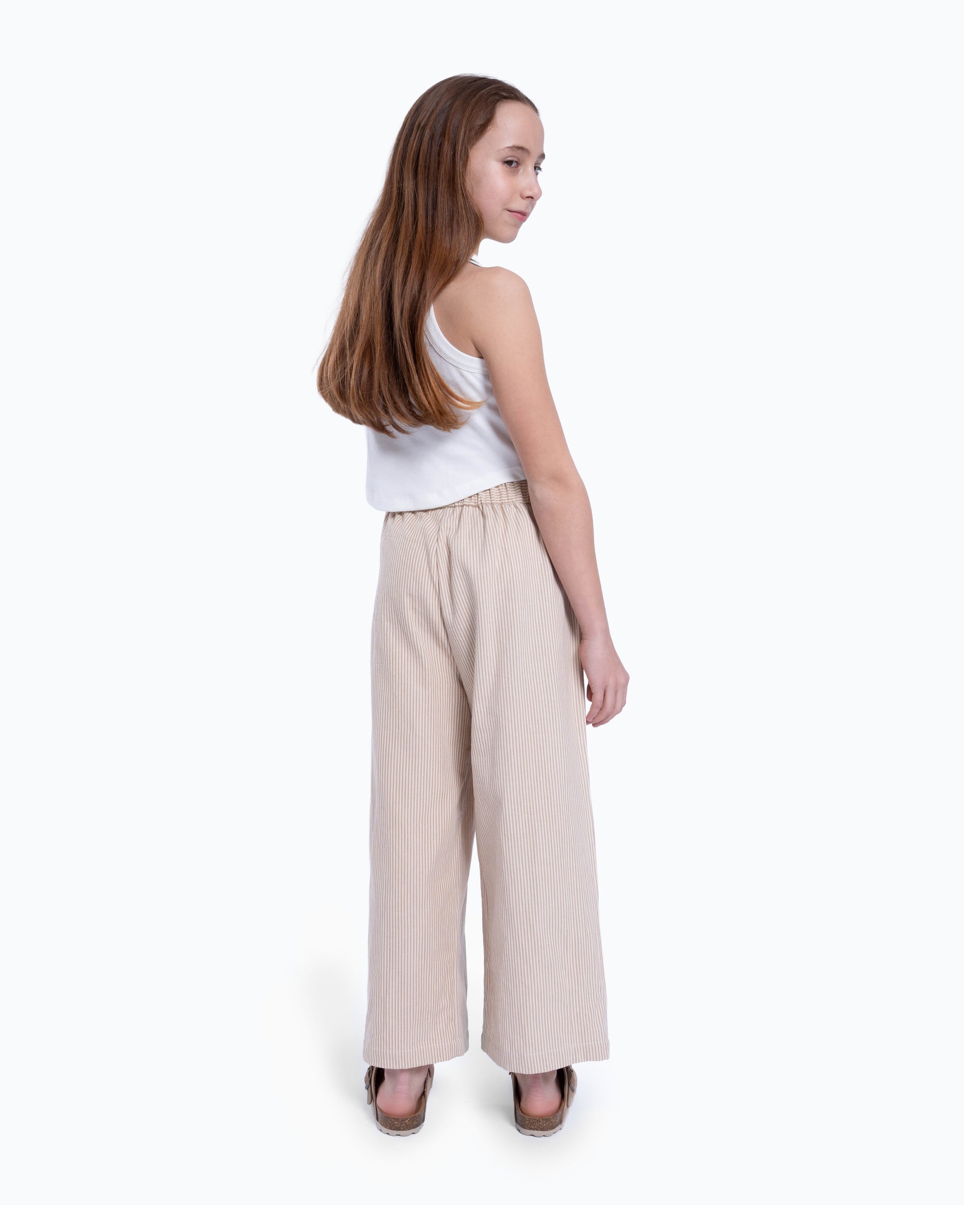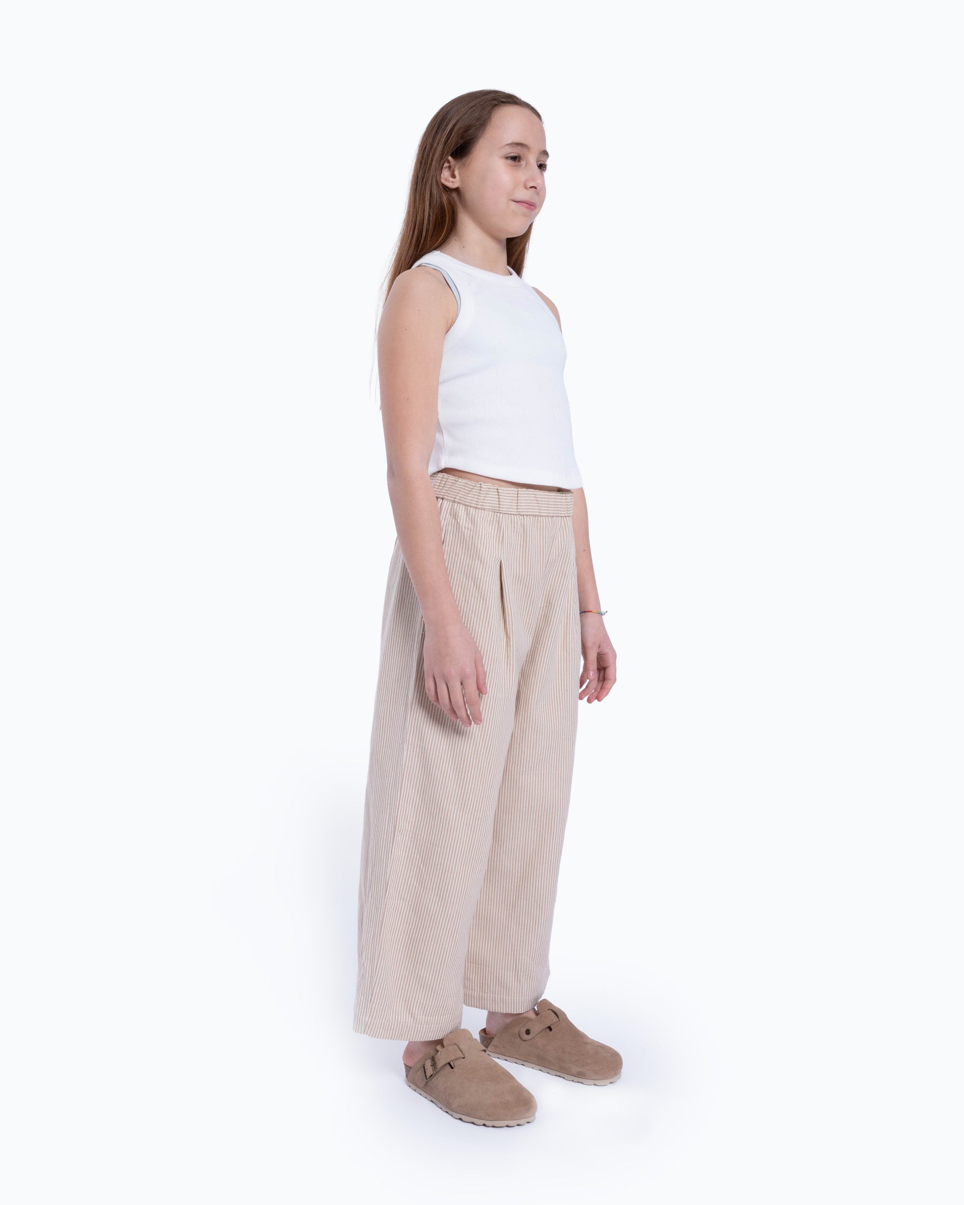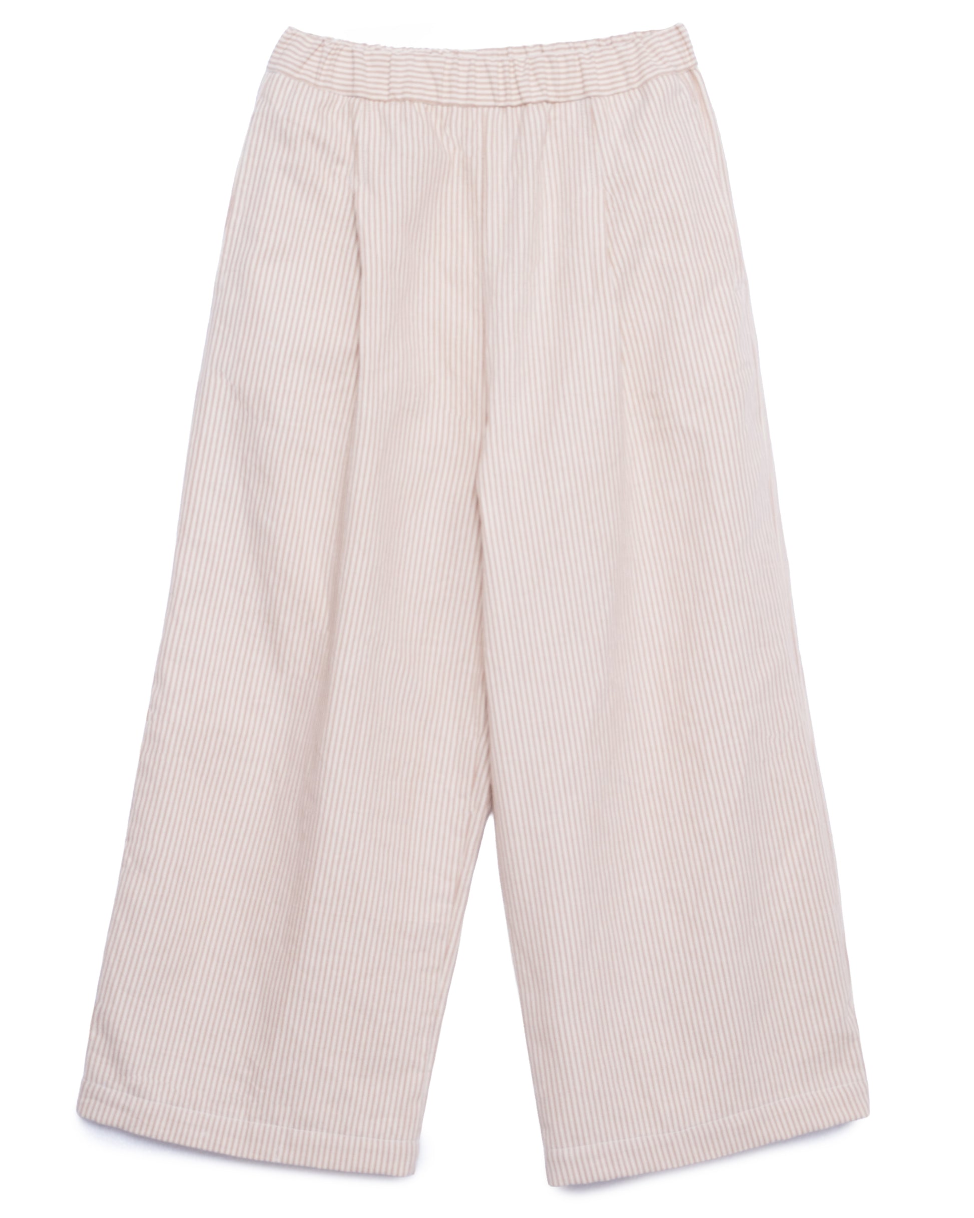 Padrão riscado subtil, combinam leveza visual e estrutura suficiente para um caimento equilibrado. A cintura elástica adapta-se confortavelmente ao corpo, garantindo autonomia e praticidade no dia a dia.
